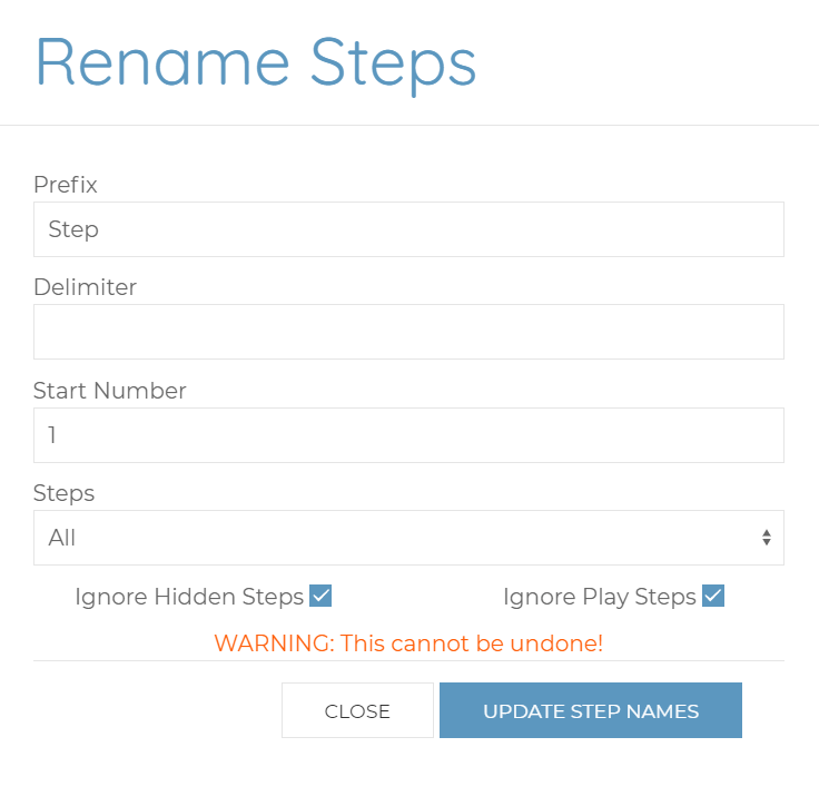By default, when you create a step it just calls it “Step” and then a rolling number which increases as you create steps. Certain functions such as a manual reorder, deleting a step or a reverse can result in the step numbers being out of order. Of course, you can manually rename any step you wish, but if you just want a simple naming convention you can use the rename tool rename all the steps for you. With the tool you can set a prefix, delimiter, start number, which steps are affected and whether hidden and play steps are included.